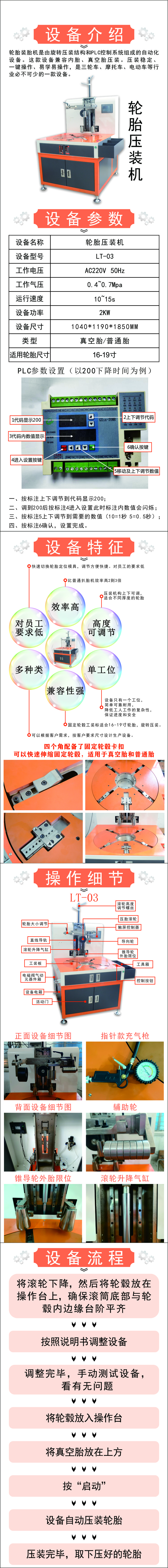 自动装轮胎机是用来拆装带有挡圈的轮圈和轮胎。使用时要正确选择好工装,先把工装放在工作台上,再将轮毂放在工装上,操纵压头用工装压在轮胎上,将其压入轮毂,后用引导环将卡环装入。其操作便捷、功能强大、经久耐用,适用于给种类型轮胎的拆装,是各类大、中型轮胎零售店的理想选择。