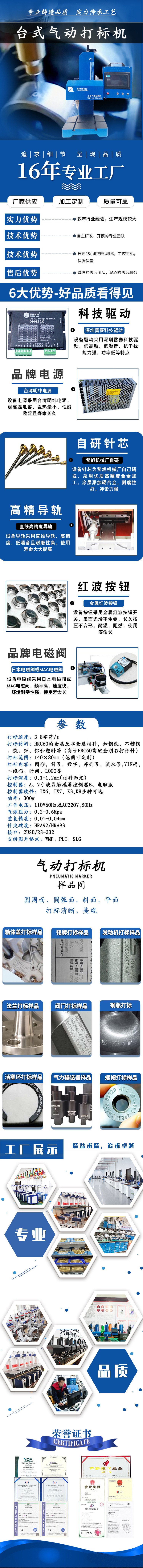 铭牌气动打标机是一款专门针对铭牌打标的设备,该设备在台式气动打标机的基础上加装手动或气动铭牌夹具,通过夹具给铭牌定位,免去铭牌左右滑动的困扰,达到标记美观的效果。
