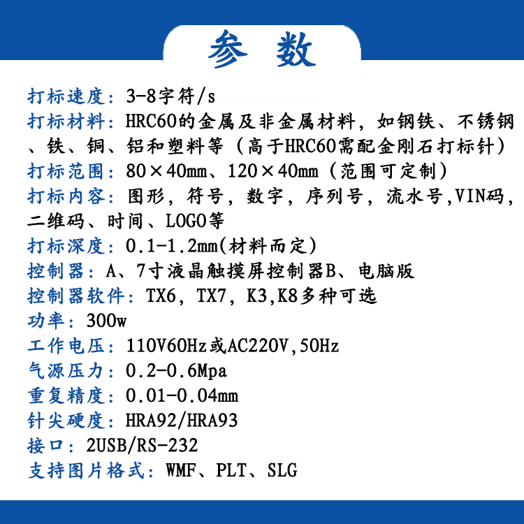 1、专用进口硬质合金打标针,打标深度可达0.1-1.2mm(视材质而定);