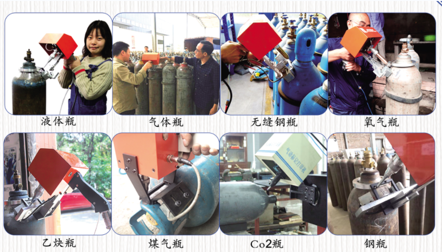 目前主要用于天燃气钢瓶、液化气钢瓶、氧气钢瓶、氮气钢瓶、乙炔钢瓶、铝瓶、灭火器瓶、民用钢瓶、液体罐等各种钢瓶进行字符打标。